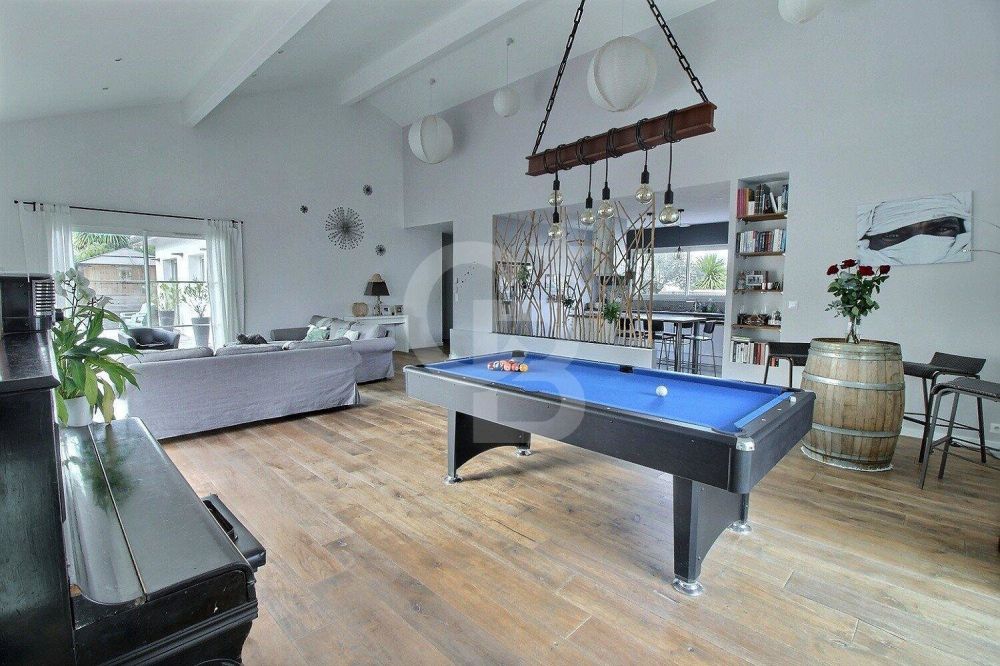 Une fois la porte poussée, vous découvrirez une pièce de vie "cathédrale" de 60 m², baignée de lumière et offrant une ouverture sur la piscine chauffée et le jardin ensoleillé tout au long de la journée.