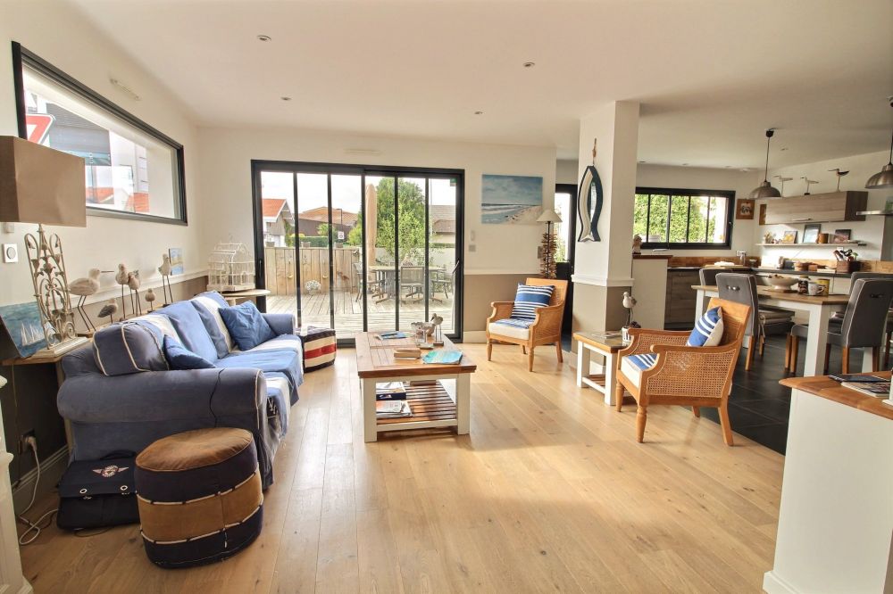 Une terrasse exposée sud, coulissante, laisse apparaître une piscine (bassin) : idéale pour se rafraîchir au retour de plage.