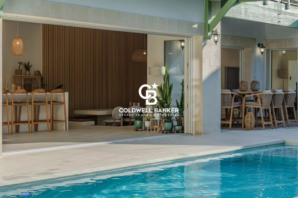 Les extérieurs reflètent le même raffinement : 400 m² de terrasses, une piscine chauffée au sel, un double garage et des matériaux soigneusement choisis mêlant tradition et modernité.
